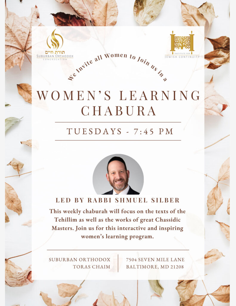 Shiur for Women on Tuesdays at Suburban Orthodox. Join the Whatsapp Chat for Scheduling updates.